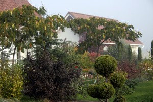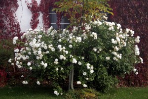 A legszebb bokor már eléri a magasságomat, és a diófával versenyt nő. Ontja a fehér ártatlanságot magából. A vadszőlő borvörös árnyalatait a köd kicsit átszitálja, de emlékezetes a pillanat, és egyáltalán nem vagyok benne biztos, hogy csütörtök reggel is ilyen szép lesz, ugyanis lassan, de biztosan bejön a téli hideg az udvarra.