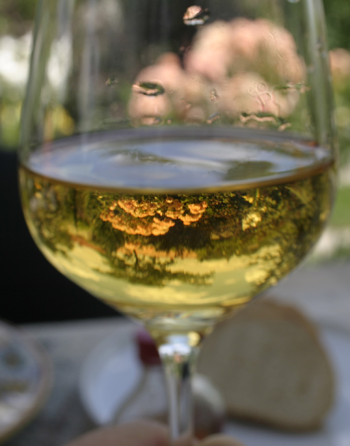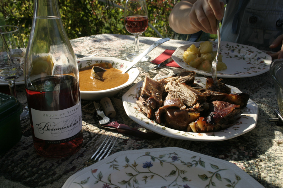 Szerencsére délutánra felerősödött a napsütés és végre leülhettünk a szaletli árnyékában egy jót ebédelni barátainkkal. Sült pulyka, kielemezhetetlenül variált mártás, köményes burgonya, és egy kellemesen bíborszínű francia Rosé.