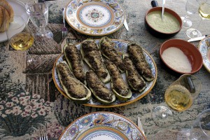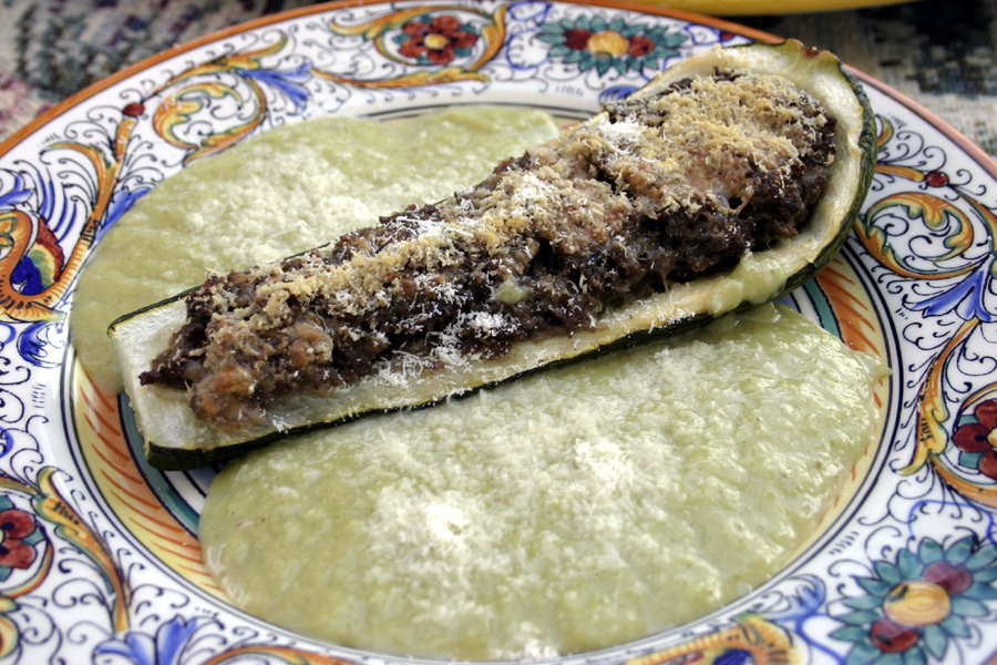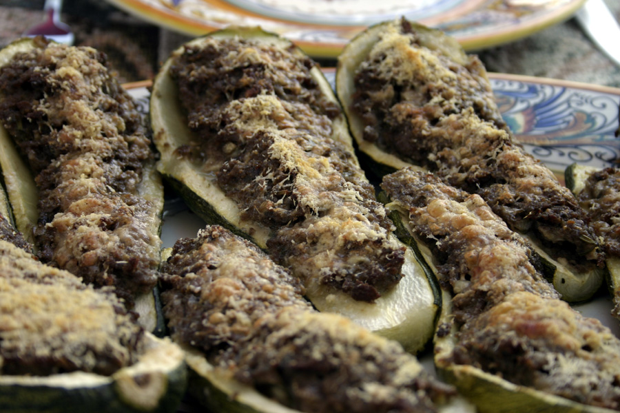 A cukkíniket félbevágtam, kibeleztem, és marhanyakból készített – igen rendesen fűszerezett – darált húst helyeztem bele. A tetejére parmezánt szórtam, megsütöttem. Az egész étel nem túl bonyolult, és itt is azt tartottam szem előtt, hogy a zöldségek frissessége, üdesége kerüljön előtérbe.