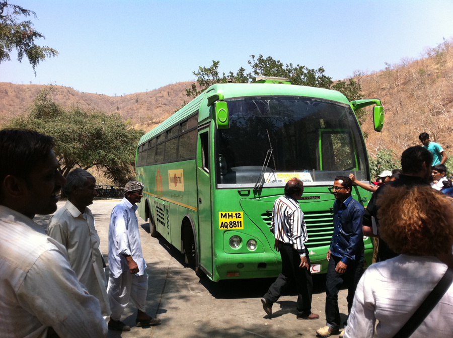 Az út 2012 márciusában sem sokkal különb, hacsak azzal nem könnyebb, hogy légkondicionált, indiai piacra gyártott Toyota viszi hasában az utazókat, és a motorizáció eluralkodott a tájon. De Adzsanta védett terület, így kötelező letenni az autót, és az azóta kiépített keskeny utat már állami busz járhatja csak viteldíj ellenében. A márciusi meleg még szinte hideg a helyieknek, ám bennünket már a parkolóban éget a nap. Keveredünk a helyi turistákkal, felzsúfolódunk egy olyan szakadt buszra, hogy a padozatán át lehet látni a motort, a váltóművet, a fogaskerekeket. De haladunk, nyakunkban egy falunyi férfiemberrel. A busz egy darabig elvisz, leszállunk, és beleszaladunk a világot tönkretevő túrista-kacat-árusok szellemtelenül kialakított városkájába, ahol 20 percig kell lerázni a tiltott árusoktól kezdve a licences gazemberig mindenkit. Ahogy modernizálódik a világ, azonnal a sarat dobja fel a rendszer, nem a szerény értéket.
