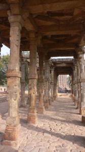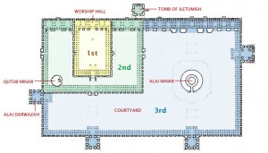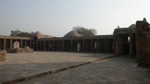 vasoszlop is található. A belső udvar falain kívül egy látványos árkádsor húzódik, mely oszlopain keresztül remek rálátás nyílik a félbehagyott minaretre, az Alai Minar-ra. Az álló képen látható, hogy a hindu templomokból elhordott oszlopokat egyszerű kőgerendákkal kötötték össze, majd a sarkokat lefedve, három rétegben zárták le a födémet. Stabil, egyszerű, időtálló szerkezet. A belső udvar falai nem engednek bepillantást, egy befelé nyitott kerengőt határolnak, melyet a bejáratoknál kupolával zárnak le. A belső kerengőnél még egy lépcsőfokot feljebb kell lépni, így szemben állva láthatjuk a mecset imahelyének megmaradt boltívmaradványait. A középső rész előtt áll a vasoszlop.