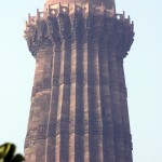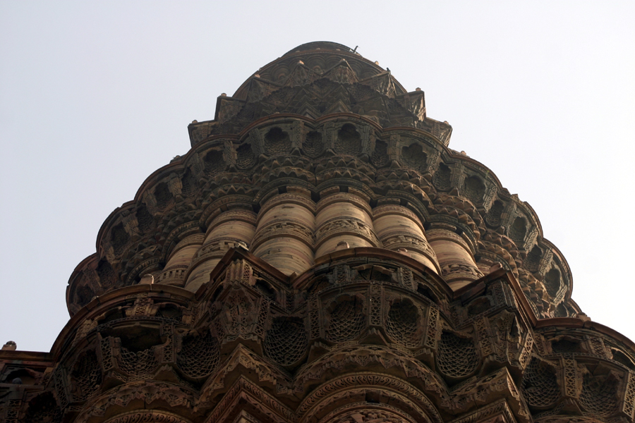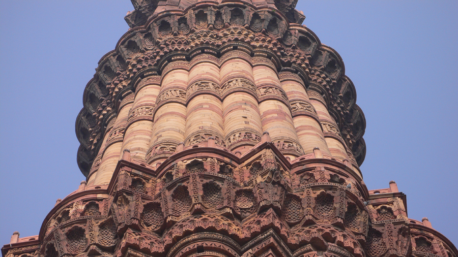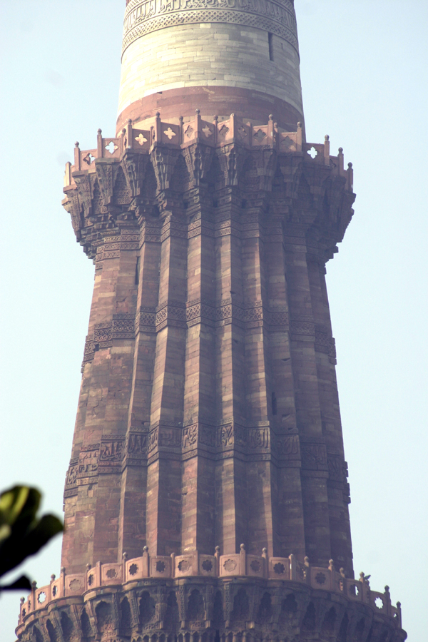 A leírás közepére hagytam a leglátványosabb építményt, magát a minaretet. Ha messziről felnézünk rá, akkor láthatjuk, hogy a torony felsőbb részén megtörik a szabályosság. A leírások azt mondják, hogy angolok restaurálták, és ferdére alakították ki a bordákat, de itt nem egyszerűen erről van szó.