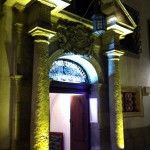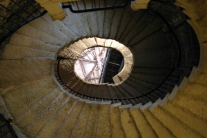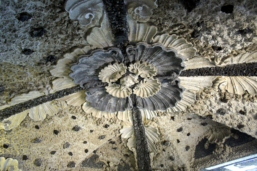 A jobbra lévő képen egy furcsa, középkori stílusú körlépcső található, mely a legmélyebb szintről a tetőszerkezetig tart egy légteret. A bal oldali képen az erősen túldíszített boltozat látható.