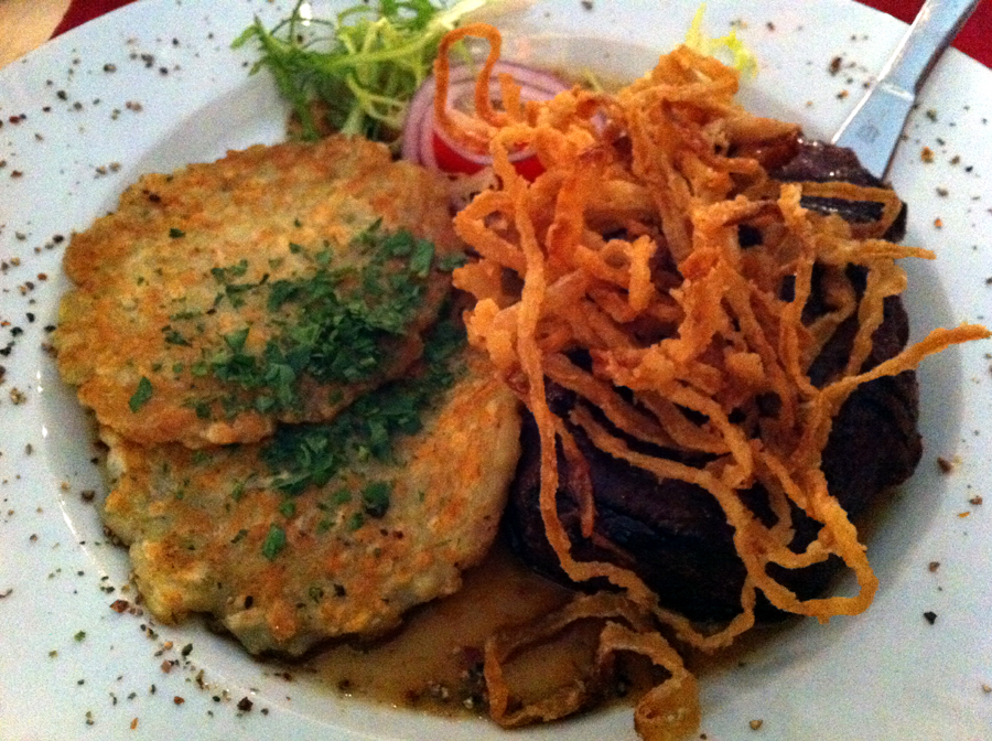 Az itallapon csodás találmány köszön vissza, a decis poharakban felszolgált kóstoló, mely kapcsán pontos körképet szerezhetünk a nekünk tetsző sörről, és az elbizonytalanodás hátrahagyását követően immáron kedvencünket kérhetjük le újra, emberi mennyiségben. Sajnos a kép nem jó, nem adja vissza a marhahús élményét, de annyit elmondhatok, hogy nullás vércsoportú révén nem tudtam ellenállni a hagymás rostélyosnak.