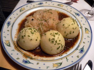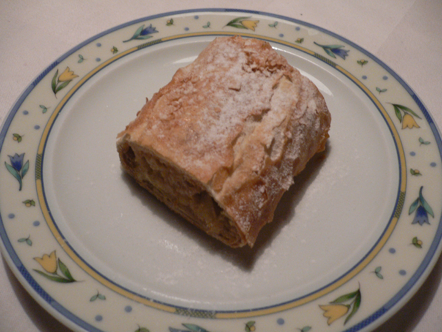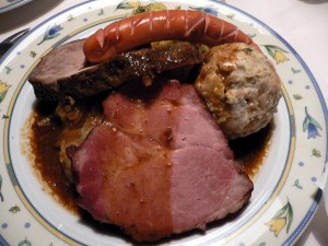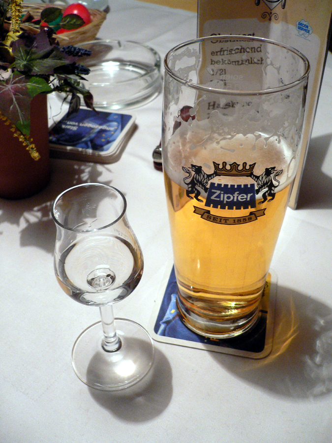 Miután szerencsésen megérkeztünk a fogadóba, azonnal lementünk vacsorázni és „bitte schön” megrendeltük a szokásosat. Házi szilvapálinka, nagy sör, ásványvíz. (Hausbrand Zwetschkenschnaps, Zipfer, Mineralvasser) Valamint sonkával töltött gombóc barna, generálszósszal és káposztával (Hascheknödel), valamint Parasztlakoma (Bauernschmaus). Legvégül almás rétes, (Apfelstrudel).