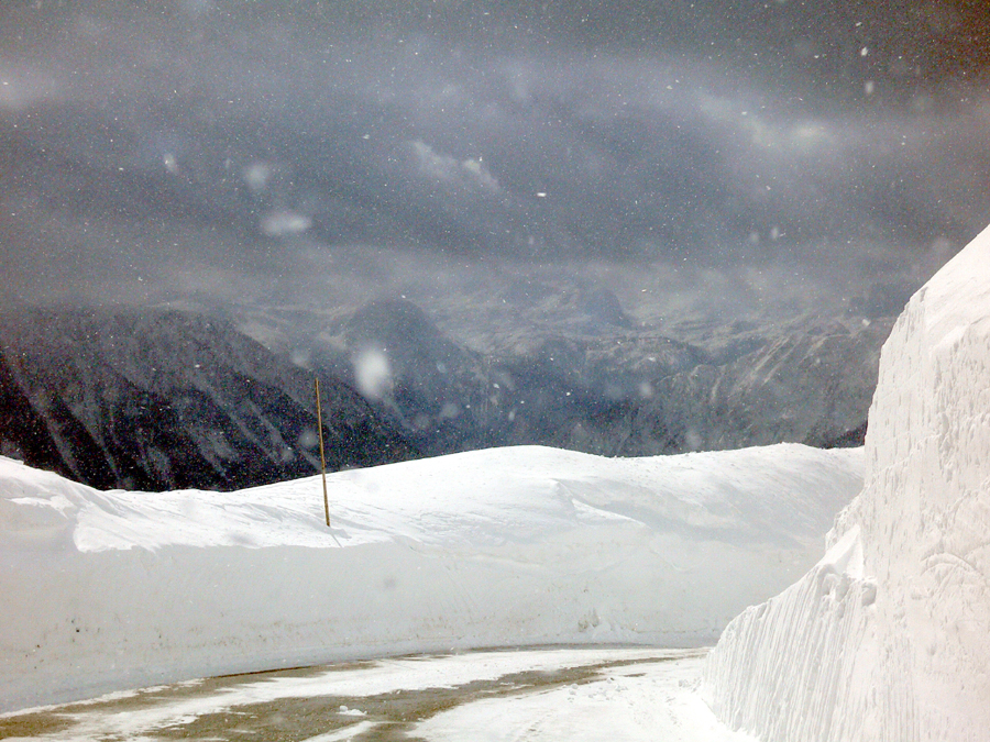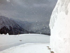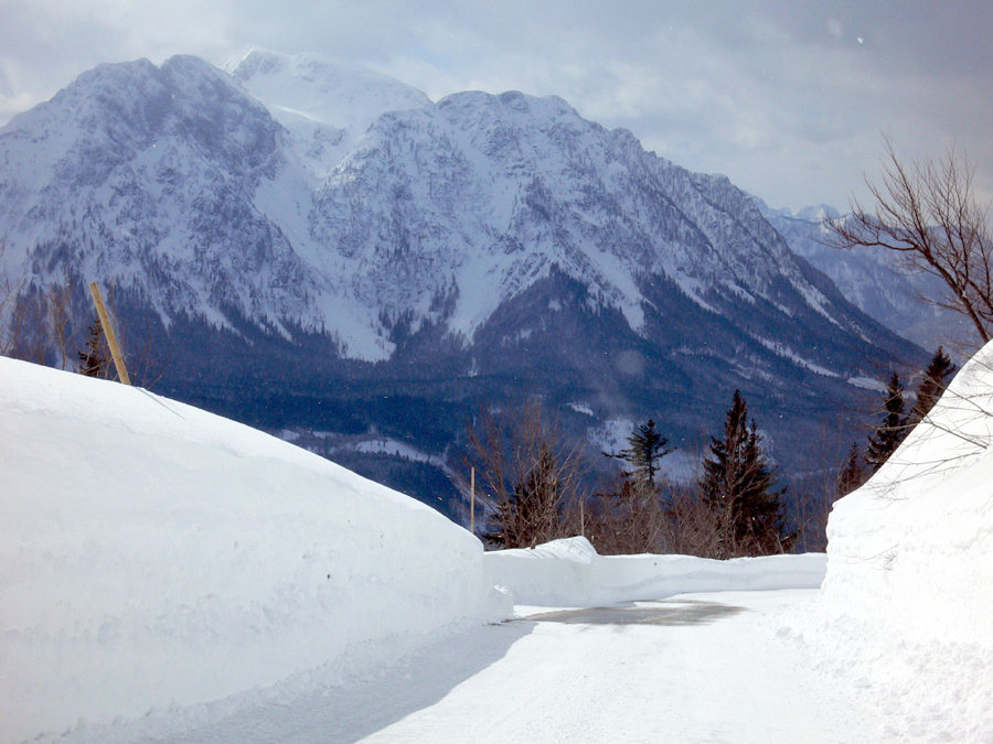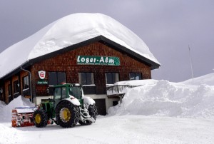 Sajnos, amikor felértünk a teraszra, akkor láttuk meg, hogy azért volt elég nagy a hó, mert a hómaró alig néhány száz méterre járt előttünk. Persze az étterem zárva volt, se Germknödel, se Almdudler, csak hó!