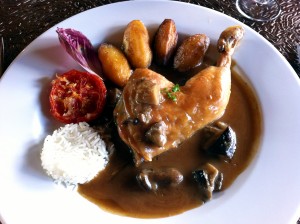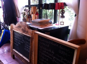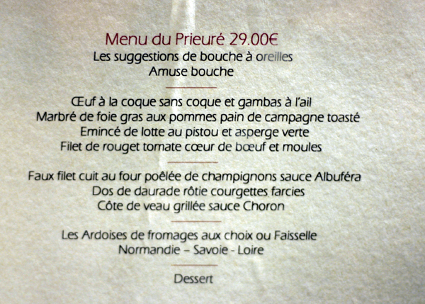 Amikor vacilláltunk, a fogadós intett nekünk, hogy nem fog minket megsütni másnapra, kerüljünk beljebb. A kerthelyiség minden sallangtól mentes. Sem a kockás abroszos, sem a lounge hangulat felé nem szédelgett el. Maradt reális. Angol menü nincsen, meg kell tanulni franciául az ételeket. Ám annak sem látom értelmét, hogy idehaza már minden szakács francia nevekkel dobálózik, mivel megtalálta a fakanalat a fiókban.