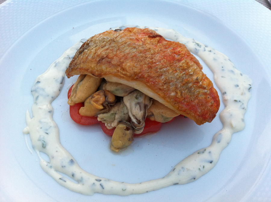 A következő fogás egy szelet hal, némi kagyló, melyet addig gyűlöltem, egy kis paradicsom ágy és joghurtos öntet. Mi kell hozzá? Hát friss hal, friss kagyló, friss paradicsom. Minden van a közelben, nem kell semmi hókuszpókusz.