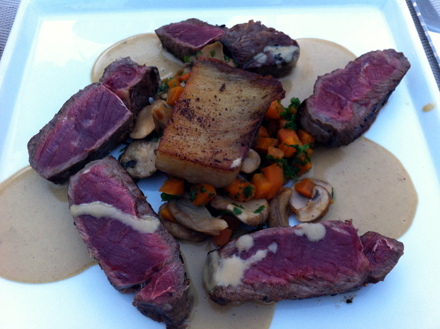 Ezt követően jött némi húsos ármány, a szuper francia burgonyával. A húsok számomra ismeretlen állatból valóak, ugyanis a helyi henteseknél sem láttam a hazai combokat és zsíros cupákokat. Itt másképpen vágják a más fajtájú állatokat, és nem verik a mellüket, hogy a szürkemarha a világ legjobbja. A part és Párizs között vagy 20 fajfa marhát láttam. Tudománya van a szakmának, nem a mellébeszélés az úr.
