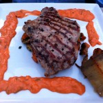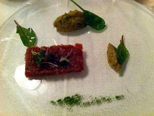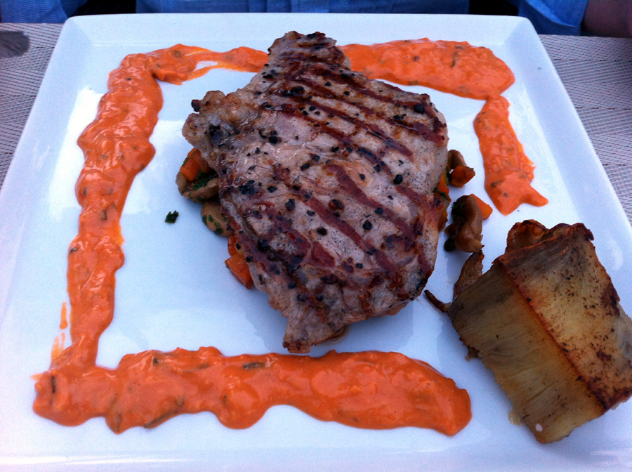 Mondhatni ez is egy klasszikus. a tonhal tatárhoz friss, kiváló minőségű hal szükséges. Késsel összeaprítják, fűszerezik. Semmi nagy kunszt. A köret padlizsán, melyet passiógyümölccsel vadítottak meg. Ez pedig igen emlékezetes ízekkel véste be magát az emlékezetembe. Ha csak ennyi lett volna a vacsora, már akkor is jól éreztem magamat.