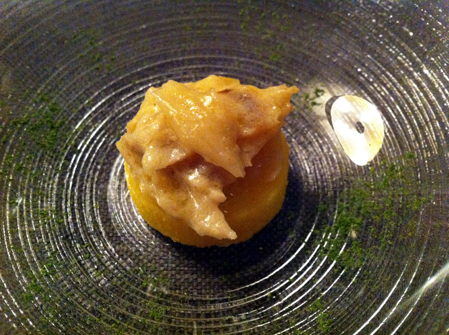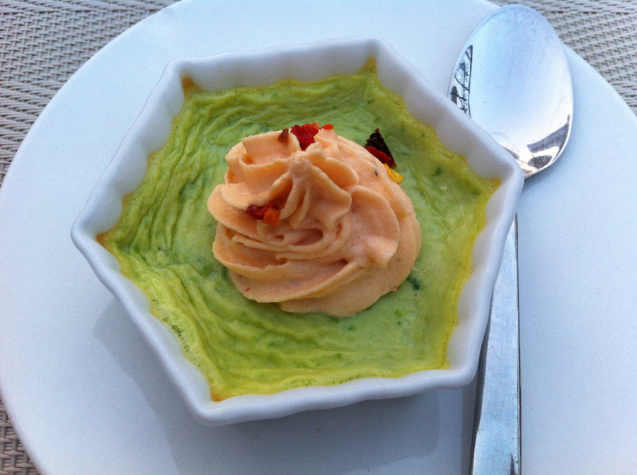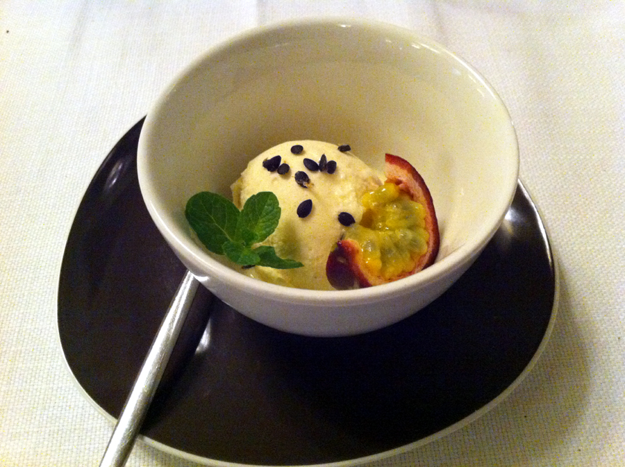 Értelemszerűen passió gyümölcsből készített szorbet. Tökéletes lazítás, de arra nem esküszöm meg, hogy mikor következett sorra. Ugyanis én most a menü alapján írom a fogásokat, de a szorbet általában két jelentősebb étel között illesztődik be, nem a desszert előtt.
