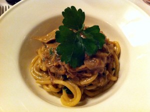 A bigoli egy olasz tésztafajta. Pont olyan, mint a képen. A ragu kacsahús és articsóka volt hozzá. Könnyed, egyszerű fogás, de úgy emlékszem, ezt megelőzőleg még volt egy rántott borjúmirigy, melyet a képen látható módon szervíroztak. Az az igazság, hogy ez remek volt. Kalla Kálmán asztalánál ettem legutóbb zsályával elkészítve, krémes mártással. Ez semmivel nem maradt le tőle.