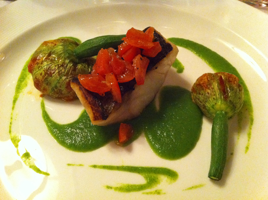 Branzino arrosti con zucchine e fiori di zucca farciti