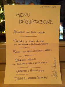 Párom csak egy szimpla vacsorát kívánt, hiszen ismerte, hogy a kis adagok ellenére sem könnyű felállni az asztaltól, ha igazán jó a séf. Mivel a menüsort Franceso megörökítette nekem saját kézírásával, innen fogok puskázni. A képeket egy iPhone készítette, így annak minősége nem túl meggyőző, de sokkal jobb, mintha az sem lenne.