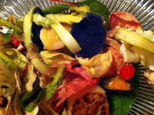 Ám a második fogás már maga volt a Kánaán. Tenger gyümölcsei saláta, egy kicsit másképpen: a két nap legszebb fogása. A lila burgonya már több ízben szerepelt a tányéromon, magam ugyan még nem készítettem el soha, de a legtöbb ember számára teljesen ismeretlen. Nem is kell mit mondani, kérem, csak gyönyörködni!