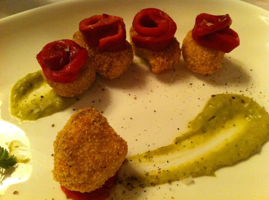 Emlékezetem szerint egy üveg helyi fehérbor volt a kísérő – sajnos nem jegyeztem fel a fajtáját – és csak annyi kérésem volt, hogy az ételsorban ne legyen hús. A többit a séfre bíztam. Addig is, amíg az ember elmerengett a Basilica Palladino csodás homlokzatán, és a rendesen aláhulló esőn, egy kis bemelegítőt hozott a pincér. A szokásos falatka, melyre már nem emlékszem, csak az ragadt meg a fejemben, hogy soha rosszabbat.