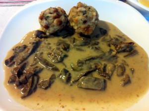 A tapolcai Pápai Húsboltban vettem jó minőségű kacsamellet és olyan szárnya tövét, melyet sütőben lesütve lett egy adag jó minőségű zsírom, melyben este májat sütöttünk le hideg fogásnak. A kisütött bőrös részt és a kevéske húst apróra vágtam és hozzá adtam a korábbi kacsasütés apró nyesedékét is. Így együtt pároltam át a pecsenyelében, majd azt dúsítottam fel tejszínnel és sűrítettem az egészet.