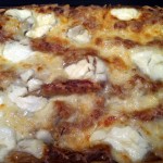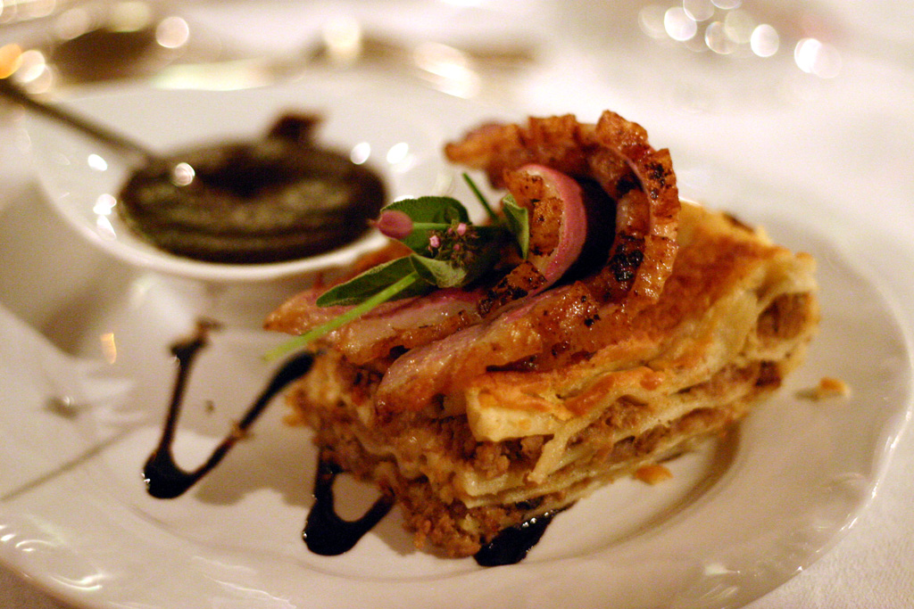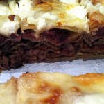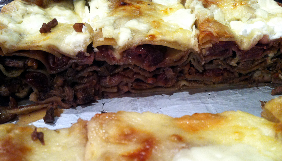 Egy kis cukrot karamellizáltam és abban késsel apróra vágott diót forgattam meg, szintén tejszínnel – és vízzel – felöntve. Amikor minden készen állt, a lasagne tésztát rétegeztem előbb a hússal és a mártásával, majd a következő szintet a dióval, melyhez meggyet – jobb híján befőttet – adtam. Majd jött újra a hús, újra a dió és a meggy. A tetejére készítettem egy pecsenyés besamelt, és így sütöttem meg.