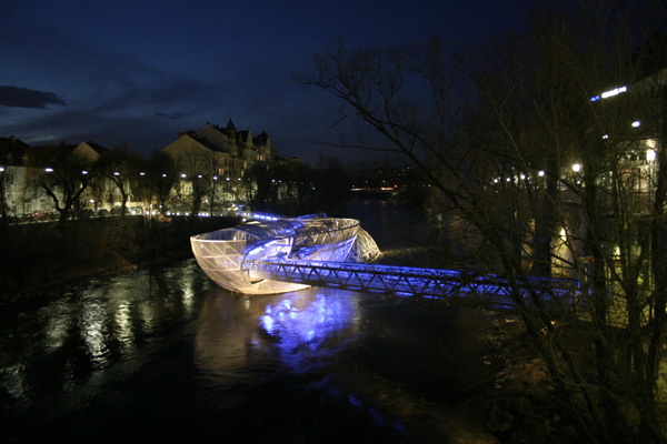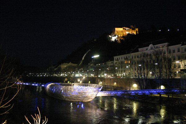 Lesétáltunk hát a Mura partjára, és onnan vettük szemügyre a hegyoldalt, az óratornyot, Graz jelképét. Ám amikor átsétáltunk a hídon a másik partra, észrevettük, hogy valami kék izé szolgál átkelőként a folyón, nem messze a hídtól.