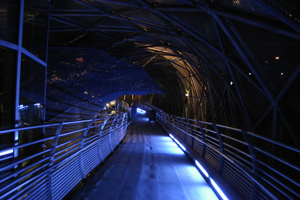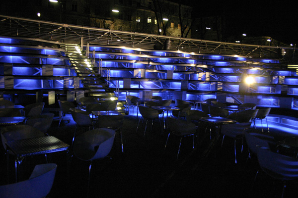 Megkerültük a hídon keresztül a létesítményt, és a jobb partról keltünk át vissza, a bal partra. A kék micsoda kétségkívül látványos alkotás, ám gyakorlati hasznát kevésbé értem. Ugyanis jó időben kellemes előadások színtere lehet, ám befogadóképessége igen szerény, így keveseknek adatik meg a lehetőség, hogy mondjuk egy stand up előadást élvezzenek végig. Mert arra bizony tökéletes lenne.