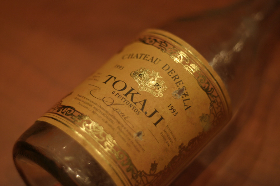 Az estét valamilyen desszerttel zártuk le – hja, barackos pitével – melyhez a legszebb bor tartozott: a Chateau Dereszla 1993-as éjjáratú 6 puttonyos Aszúja. Erről nagyon nehezen lehet bármit is mondani. Egyfelől igen ritkán kerül az asztalra egy ilyen értékes tétel, másfelől nincs is nagyon összehasonlítási alapom. A bor nem igazán sötétedett meg, szépen kibontakozott a szellőztetés után, és egy örök élményt jelentett.