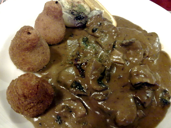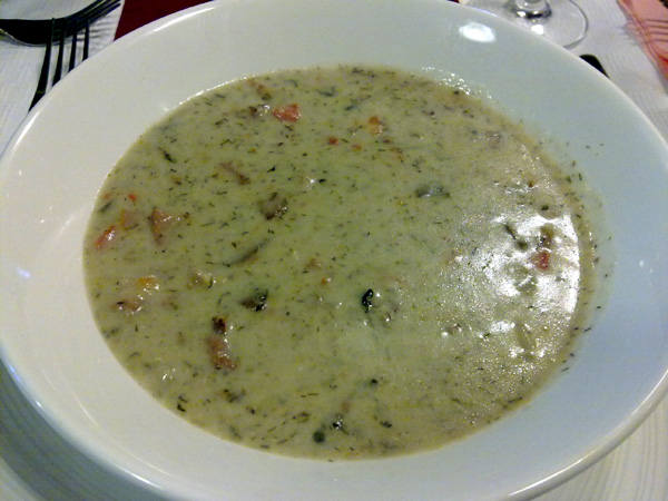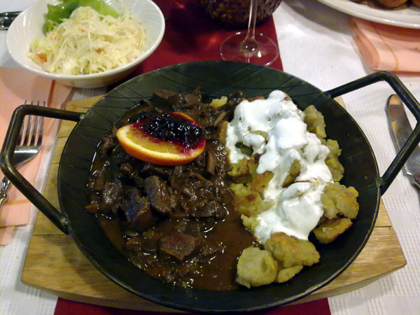 Ma mindketten csontlevest kértünk, mely korrekt volt, nem kell róla különösebben szót ejteni, hiszen csak bemelegítette a gyomrot. Ám a legutóbb fogyasztott vad raguleves annál inkább emlékezetünkbe vésődött. A besűrűsödött, igen gazdagon – főleg kaporral – fűszerezett levest leginkább főételként kell elképzelni, mert ha az embernek nagyobb a szeme, mint a szája, akkor könnyen indokolatlanul degeszre eheti magát. Ha mindenáron ki szándékozik próbálni valaki egy főfogást is, akkor ajánlom, csak egy fél adaggal kérjen a remekműből.