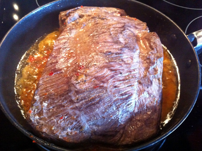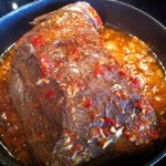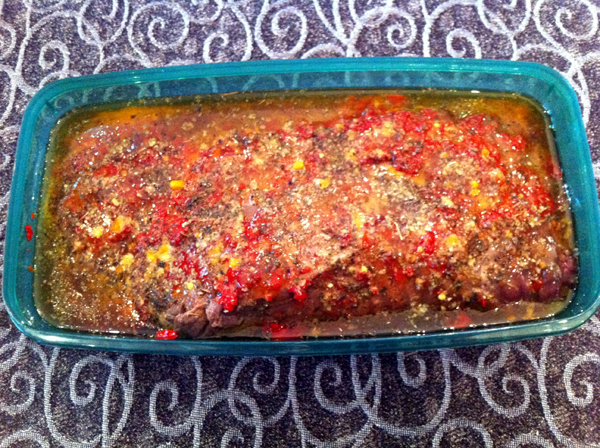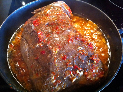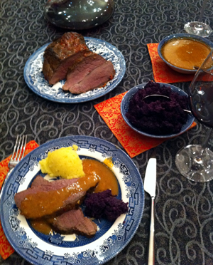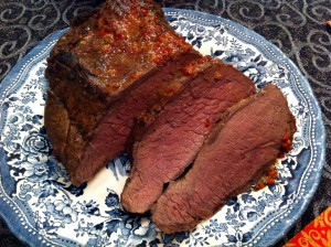 Még karácsony előtt egy kicsivel kaptam egy gyönyörű szarvas combot, nem igazán értek hozzá, de úgy sejtem, ez a comb azon nemes része lehetett, melyben nincsen ín, kötőszövet, semmilyen zavaró körülmény, így a hús tökéletesen homogén egységet alkot. Mivel az ünnepek előtti nagy rohanásban nem volt időm vele bíbelődni, és mélyhűtőbe sem szerettem volna tenni, a család segítségével készült egy zöldséges páclé, az összes pincében fellelhető maradék és répákból, kis ecetből, borókából, etc. A húst ellepte a kihűlt páclé, és talán a kelleténél tovább is ázott benne – nem tudom. Pénteken kivettem a léből, befűszereztem – só nélkül – és olajos pácba tettem át. Nem mertem már kint hagyni a lében, mely egyébként szerencsés körülmények között álldogált, hiszen soha nem volt a teraszon fagypont alatt, de olyan négy fok fölé is ritkán ment föl a hőmérséklet. A fűszerezés nálam valahogy úgy megy, hogy amit éppen megkívánok. Így került bele garam marsala, chili, fahéj és más érdekesség is. Az biztos, hogy Sanya barátom házi piros aranya rendesen meghatározta a lényeget. Sajnos – mint talán már utaltam rá – nem kis mennyiségű húst el kell rontani ahhoz, hogy rájöjjek, ezzel nem lehet sietni, a vad külön odafigyelést igényel.