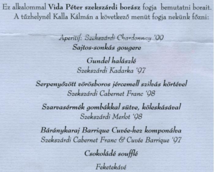 Vida Péterrel 2000-ben találkoztam először egy borvacsorán, az alábbi menüsor több szempontból is történelem. Egyrészről a séf, Kalla Kálmán, aki igen zárt körben alkot gyakorlatilag élő legendává válván, másfelől maguk a borok, melyekből jó esetben még fellel valaki a pince eldugott sarkaiban.