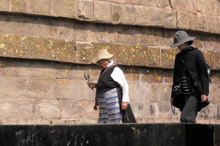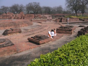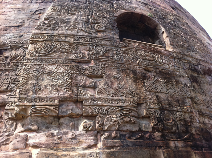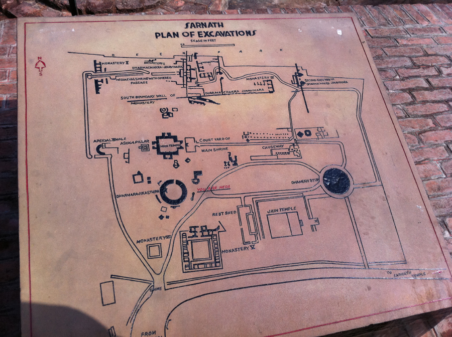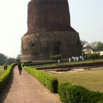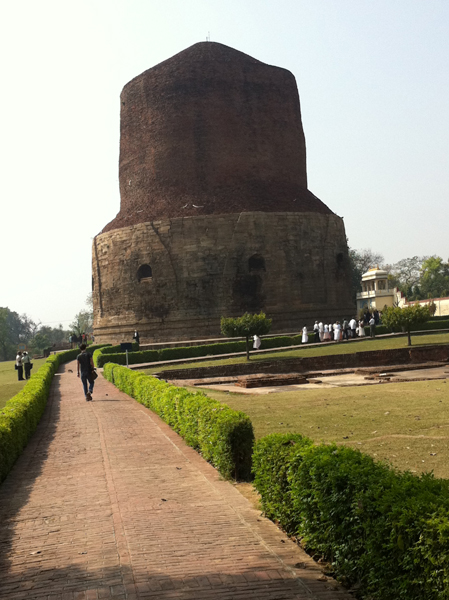 Visszatérve Szárnáthra: a kolostor romjai érdekesek, még akkor is, ha csupán a körvonalaik rajzolódnak ki. egyetlen hatalmas építmény emelkedik itt, és ez a Dhamek Stupa, melyet isz. 500-ban emeltek, hiszen az Asóka korában létesült eredeti stupa állítólag megsemmisült. Sajnos az ügyben elérhető írásos anyag számomra ellentmondó, hiszen a helyszíni információs tábla arra utal, hogy eredeti maurja kori kövek képezik az alapját. A leírások szerint ez a stupa a világ legrégebbi ilyen építménye. Egyébként benne Buddha (és talán tanítványai) relikviáit tartják, azonban egyelőre a stupa lényegét még nem igazán értem.