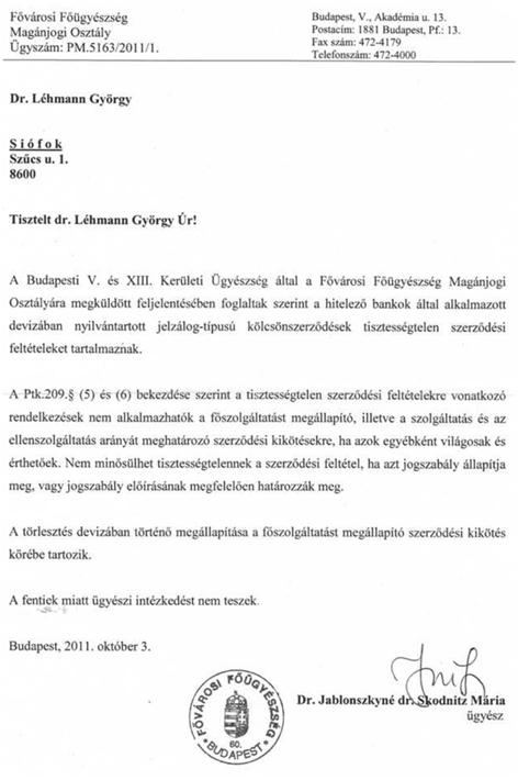 Dr. Léhmann György kollégám nem ténybeli adatok felől közelítette meg a deviza hitelezés kérdését, hanem a tisztességtelenség okán. A kérdés elsősorban a szerződés érvényességét érinti, de a banki magatartás, mint cselekvény számos büntetőjogi relevanciával rendelkezik. De lássuk az Ön által felügyelt magánjogi osztály válaszlevelét: