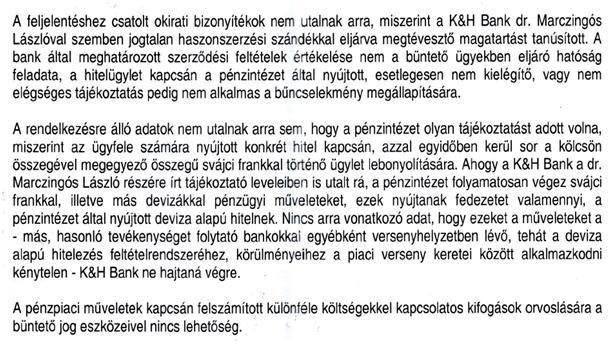 Tehát a feljelentésemen nem mást állítottam, hogy a kölcsönszerződés tartalmával ellentétben a K&H Bank nem adott nekem deviza hitelt, azaz nem adtam el neki a svájci frankot, mert nem is volt kimutatható ilyen pénzügyi folyamat. A bank nem vett fel CHF hitel azért, hogy nekem továbbkölcsönözze. Ellenben úgy tett, mintha a fentiek bekövetkeztek volna. Forinttörlesztéseimet nem váltja vissza CHF-re, hanem tovább kölcsönzi a maga forint valóságában, ám úgy tesz, mintha visszaváltaná CHF-re. Ezzel a tevékenységével minden egyes svájci frankon 4.-Ft-ot tesz zsebre, azonban mögötte nincsen semmi realitás, csak egy megfoghatatlan „portfólió”.