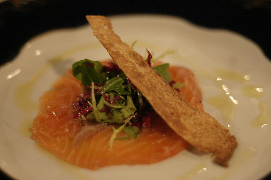A welcome drink a Gundel Prestige Brut 2005 pezsgője volt, egy árnyalatnyi édesség érzésével, mely hölgyek számára is jól fogyaszthatóvá tette az italt. A mellé felszolgált citrusos rákpogácsa isteni volt, ám nem tudtam jól odakoncentrálni, mert szerencsére sorra érkeztek a régi ismerősök, így mire mindenkivel csak néhány szót váltottunk, már el is foglalhattuk helyünket az asztalnál.