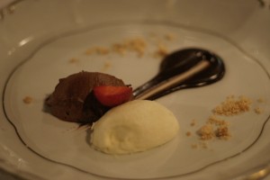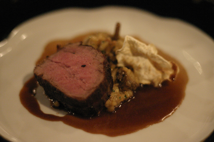 Számomra ez volt az este fénypontja, és már megannyi esetben megesett velem/velünk, hogy nem a végére maradt a „nagy durranás”. A borjú elkészítésének technikája az alacsony hőfokon történő sütés, mely főleg gépészet függvénye, de idehaza is egyre jobban sikerül az átlagos sütőmben, ha van hozzá időm és türelmem. A gombás rizottó tényleg intenzív és megnyerő volt, a hús puhasága és a rizottó krémessége mellett a vörösbor pompás párosítást valósított meg.