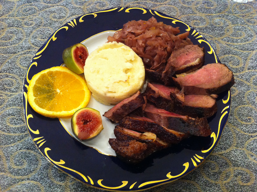 Fehér káposztát dinszteltem, só, bors, kömény, felöntöttem egy kis vörösborral, mely jót tett a színének, és beleszórtam finomra vágott szelíd gesztenyét, természetesen megsütve. Balzsamecettel locsoltam meg a végén. A kertben szert tettem némi fügére, végül a burgonyapürét szelíd gesztenye forgácsokkal és szerecsendióval ízesítettem. Természetesen egy profi jobban elkészíthette volna, de nem kergettek meg engem sem a ház körül.