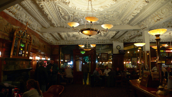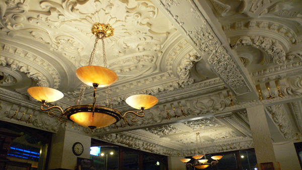 Legnagyobb hatást azonban a még lejjebb, a Lime str-en, a vasútállomás felé a THE CROWN gyakorolta rám. A hely belső kialakítása pompázatos. És csönd van! Egy kevésbé bulizós, idősebb korosztály látogatja. Ilyen gazdagon díszített mennyezetet eddig csak palotákban láttam, nem kocsmákban. De ilyen is van, és ez öröm, pláne, ha azt mutatom meg az asszonynak, hogy nem is kocsmáztam, hanem könyvtárbaj jártam…