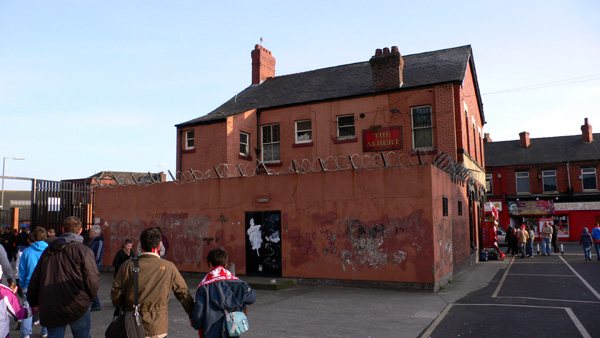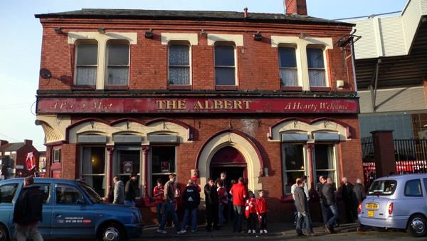 Kezdjük a kocsmák taglalását egy olyan műintézménynél, melyhez foghatót soha nem láttam, és soha nem is hallottam róla. Az Anfield Road, mely mentén maga a stadion áll, kísértetiesen emlékeztet engem gyermekkorom Angyalföldjére, de inkább Újpestére. Eléggé régi, kopott munkásnegyed, annak minden tradíciójával, hangulatával. A stadion mellett áll a THE ALBERT. Az a kocsma, melynek építményi szerkezetét nagy valószínűséggel a belső falakra és a plafonra kifeszített mezek és sálak tartják össze. Illetve a húgykő. Ezt nem tudom finomabban megfogalmazni. A kellemetlen szagú intézmény egymagában áll a placcon, már nincsen őt támogató szomszéd, és iszonyat rosszul néz ki, ám fogadni mernék, ha egyszer bontásra ítélik, akkor az összes téglája relikvia lesz.