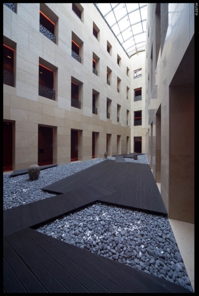 A lakószobákhoz vezető folyosók iszonyatosak. Alig van fény, és a gyanútlan vendég a sötétvörös gipszkarton falak mentén halad, ahol a szobák ajtaja is belesimul a falba, nincsen keretezés, ajtótok. A belső udvar is kriptai hangulatú, és a Zen kerthez annyi köze van, mint nekem az agysebészethez. Műemlékvédelmi előírások miatt a régi lépcsőház eredetiben maradt, ám az eltérő stílusok bántóan ütik egymást.
