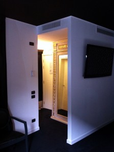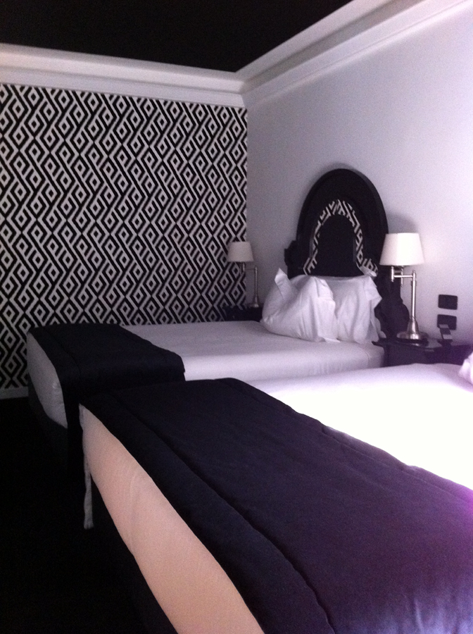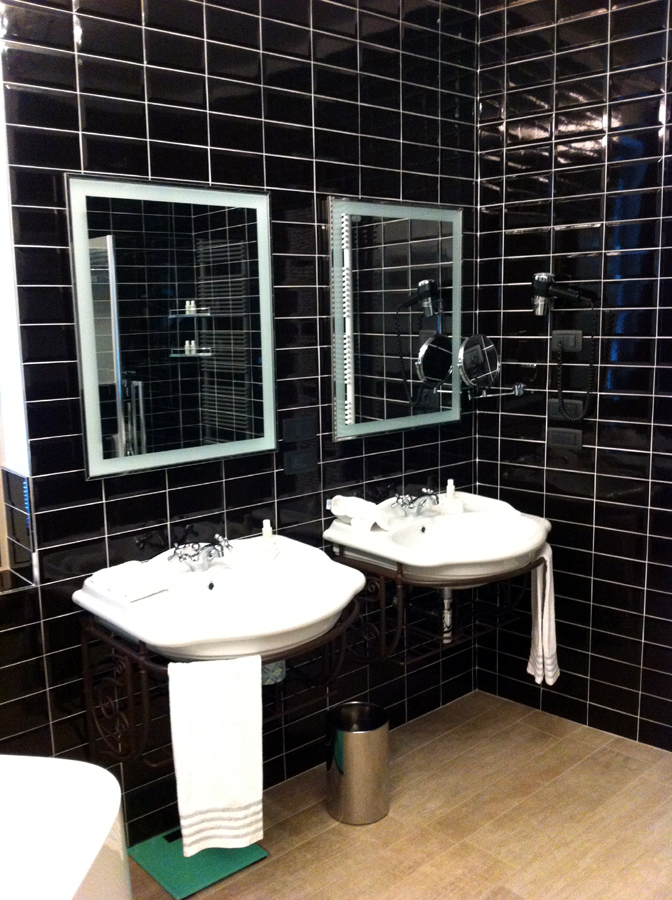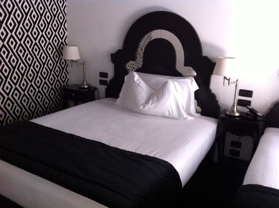Amikor beparkoltam egy fekete épület elé, mely szemmel láthatóan egy régi ház sajátos átépítése során jött létre, azon gondolkodtam, hogy egy krematórium soha nem kaphatott volna szebb homlokzatot. Belépvén a hangtalanul félresikló üvegajtón, egy furcsa világ tárult elém. Azt hittem, az Addams Family fogad majd: fekete falak, velencei csillárok, alig-fény, irányított spotok, furcsán csillogó tárgyak. De mégsem. A tulajdonosi család egyik képviselője volt a recepciós, aki őszinte udvariassággal kísért fel előbb abba a szobába, melyet nem kértünk, majd abba, melyet előre kifizettünk. Nos igen, a ravaszság terén elfelejtettem előre szólni, hogy idehaza csak az marad életben, aki figyel, és az olaszok sem arról híresek, hogy egy kis rafináltságot nem visznek bele az üzletbe.