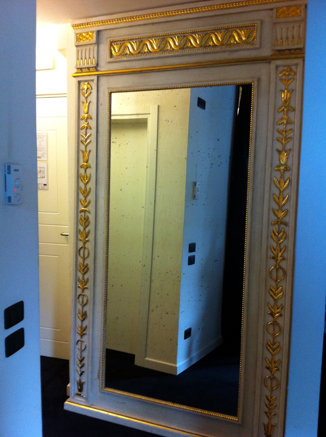 A kis előszobában egy orbitális nagyságú tükör növeli a teret. Kell is, mivel az „előszoba”, inkább csak egy belépő, de legalábbis nem egy 16 mn alapterületű szobáról van szó.