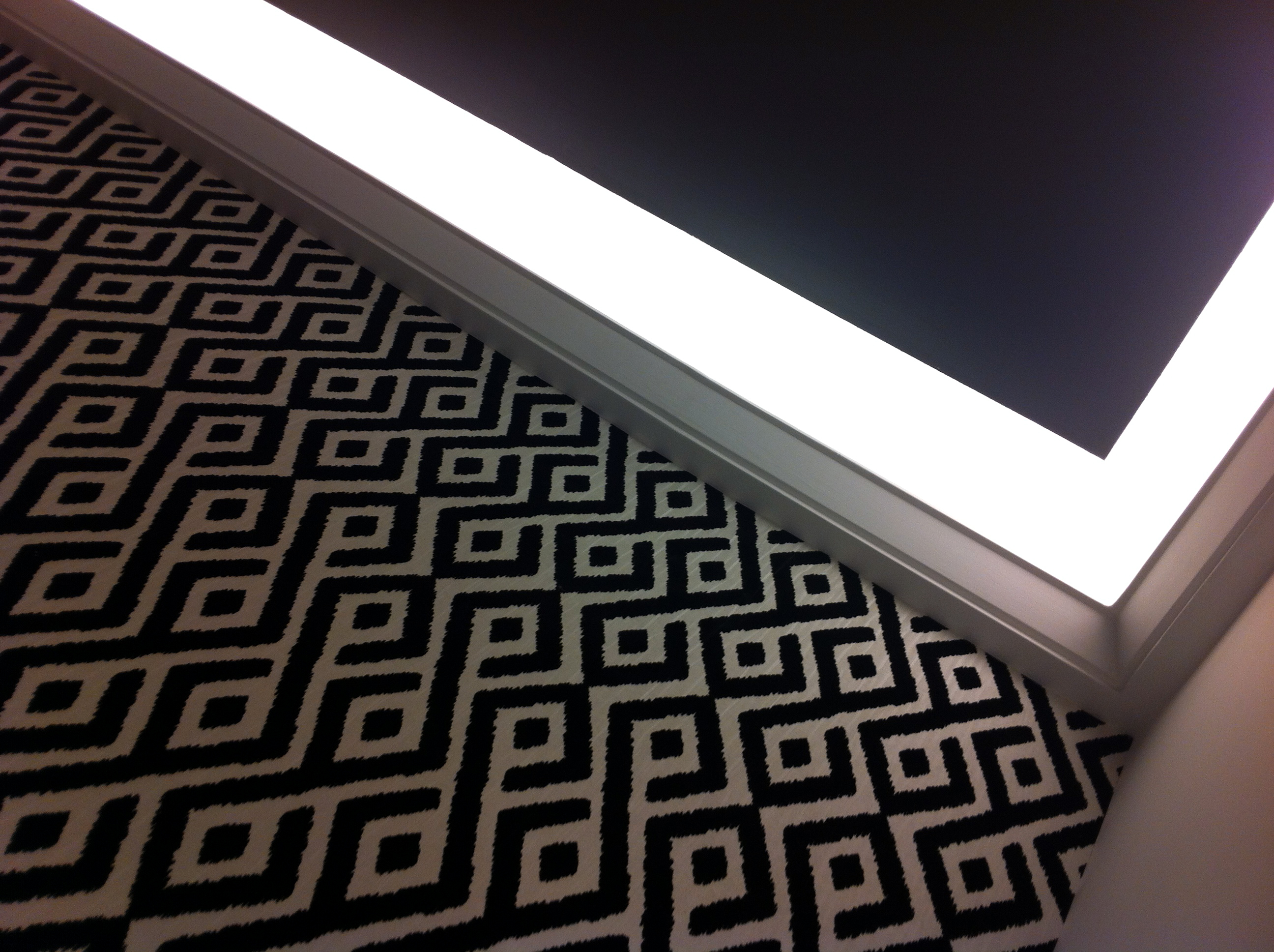 A hálószoba igen korrekt. Két hatalmas és pihentető ágy áll a fekete-fehér miliőben. Furcsa a fekete plafon, a geometrikus mintázatú tapéta, de valahogy mégis összhangban volt az egész. A jobb oldali képen érezhető, hogy természetes fény árasztja el a szobát, így a fekete nem lesz negatív vonás, csak érdekesség.