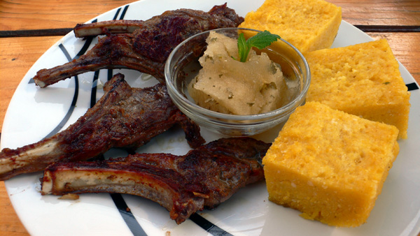 Ugyanis a sajtos-túrós polenta egyáltalán nem megszokott köret, míg a citromfüves alma zselé sem kerül minden nap az asztalra. A roston megsütött bárányborda pedig úgy volt tökéletes, ahogy felszolgálták. Itt nem az osztályon felüli éttermek – rózsaszín közepű, különleges alapanyagból, különleges eljárással készített – bordáit kell elképzelni, hanem egy tökéletesen fűszerezett, és sütött, tulajdonképpen bárki által elkészíthető húst.