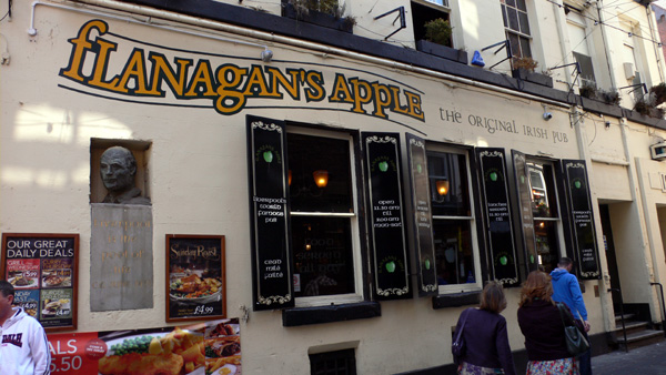 Szombaton kora délután indultam el útitársammal egy kiadós pub-körútra, melynek első állomása a Mathew Street-en lévő Flanagan’s Apple Irish Pub lett. Soha nem jártam még itt, nem hallottam róla, csak kerestünk egy olyan helyet, ahol elfogadható kocsma kaja mellé még elviselhető kosz jár. Ugyanis egy régi vágású pub soha nem felelhet meg a HACCP szabályainak, legalábbis annak, amit itthon a gyakorlatba átültetnek. Lehet, hogy egy pub konyhája – melyben soha nem jártam - megfelel az előírásoknak, azonban onnan kilépve, minden ÁNTSZ ellenőr eszméletét vesztené.