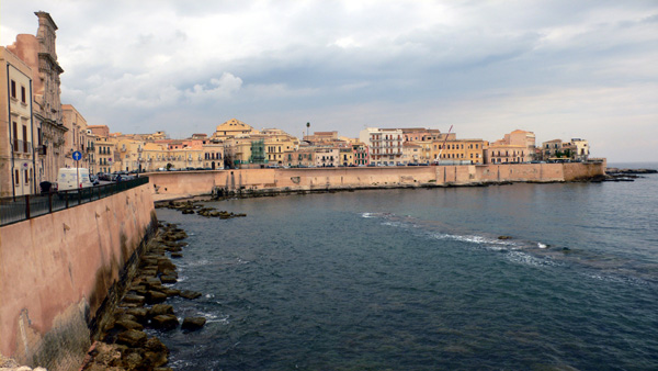 Nyílt tenger felőli oldalon, a gépjármű menetiránnyal egyezően haladtunk tovább. Érdemes megjegyezni, hogy Ortygia szigetén csak körben lehet haladni, egyirányú minden utca. Parkolni alig lehet, ha valaki nem itt lakik, akkor inkább kint tegye le az autóját. Nos, itt is szép sétálórészt alakítottak ki, ahol teraszok, kávézók nincsenek, ám egy-két szép reményű szállodát sikerült felfedezni.