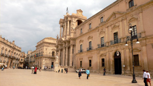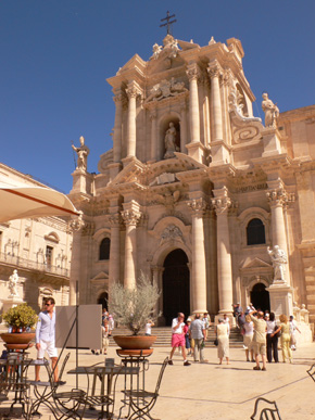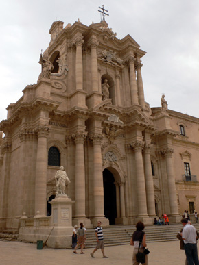 A szokásos, vörös homokkőből épített paloták közül csodásan emelkedik ki a klasszikus barokk homlokzattal ellátott Duomo, mely alapja egy ie. V. századból való Athéné templom. A belsejében csodálatosan megtekinthető a keresztény templommá történő átépítés minden lényegi része, még amennyiben az „illesztések” elég otrombán is mutatnak. Számomra az ősi görög emlék mindennél fontosabb, így a stílusok illeszthetetlensége nem zavar. Pláne úgy, hogy az igen egyszerű belsőt egy fantasztikusan szép homlokzat szorítja a feledés homályába.