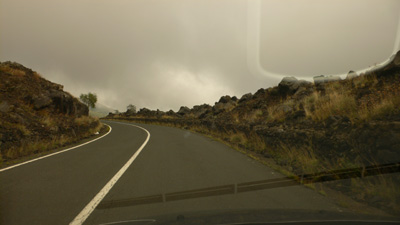 A fenti képen jól látszik az, hogy semmit nem látni, csak érezni. Itt valószínűleg arról lehetett szó, hogy amennyiben tovább maradunk a helyen, vagy elájulunk, vagy kitör a vulkán, és lávával a fülünkbe futhatunk a hegyről le. Mi majdnem megfagytunk a 3-4 fokos hidegben, és amíg a felkészült csoport elmerészkedett a ködbe vesző csúcsra, addig mi visszafordultunk.