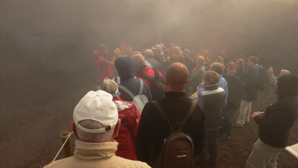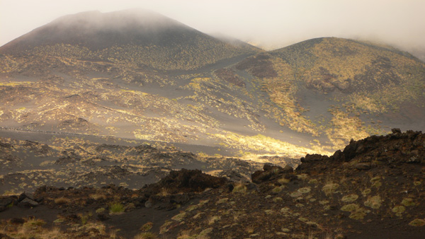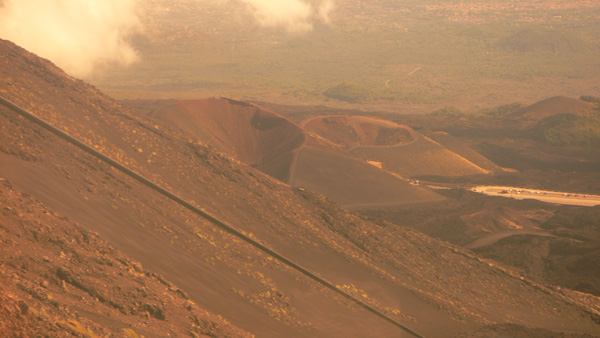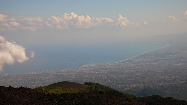Siracusa után első utunk azonnal a vulkán déli lábánál fekvő városkába vezetett, ahonnan egyre meredekebb szerpentin vezetett a holdbéli tájhoz. Az építésügyi szabályok szerint hozzávetőlegesen 1000 méter tengerszint feletti magasságig lehet építkezni, épített környezetet kialakítani, így elég nagy a kontraszt a nyüzsgő, rémesen zsúfolt városka, majd alig magasabban a vulkáni hamuval elborított táj között.