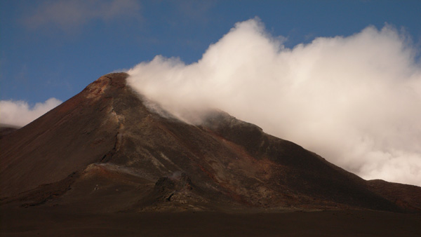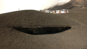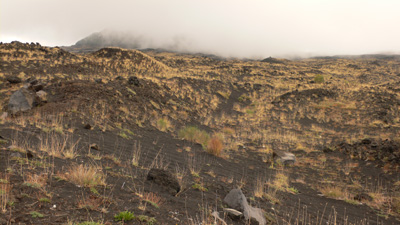 Konkrétan azt, hogy ahol állunk, az a közeli múltban 10 méterrel alacsonyabb volt, és egy menedékházat is konkrétan belepett a vulkáni törmelék, hamu. Nem kell hozzá nagy képzelőerő, hogy a hegy erejével azonnal szembesüljön a látogató, mivel a járművek “parkolójától” elindulva, egy kis mélyedésen kell leereszkedni, majd ismét emelkedni egy olyan csúcs irányába, melyről elméletileg mesés lehet a kilátás. Konkrétan a csúcsot sem lehetett látni a felhőben.