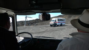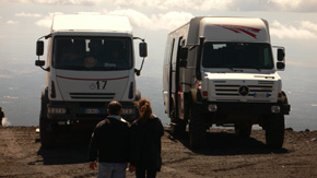 A speciálisan felkészített teherautók igen erősen hasonlítanak egy Paris-Dakar versenykamionra. A sofőr kiköpött Szőke Bandi volt – majd meg is kérdezem, nincsen véletlenül valami rokonság arrafelé – ám jelen kapitányunk is biztos kézzel vezette a nem éppen olcsósított járművet.
