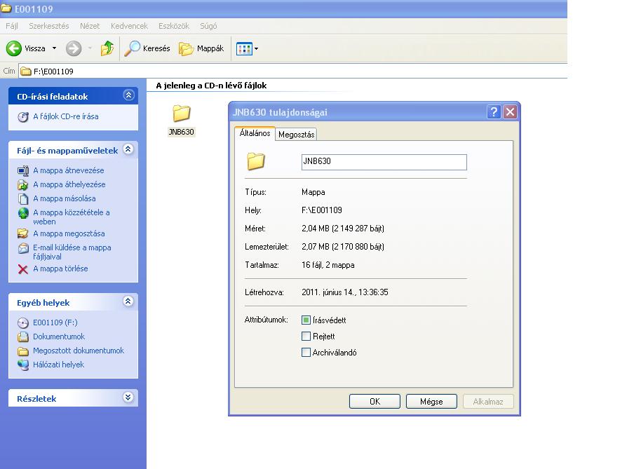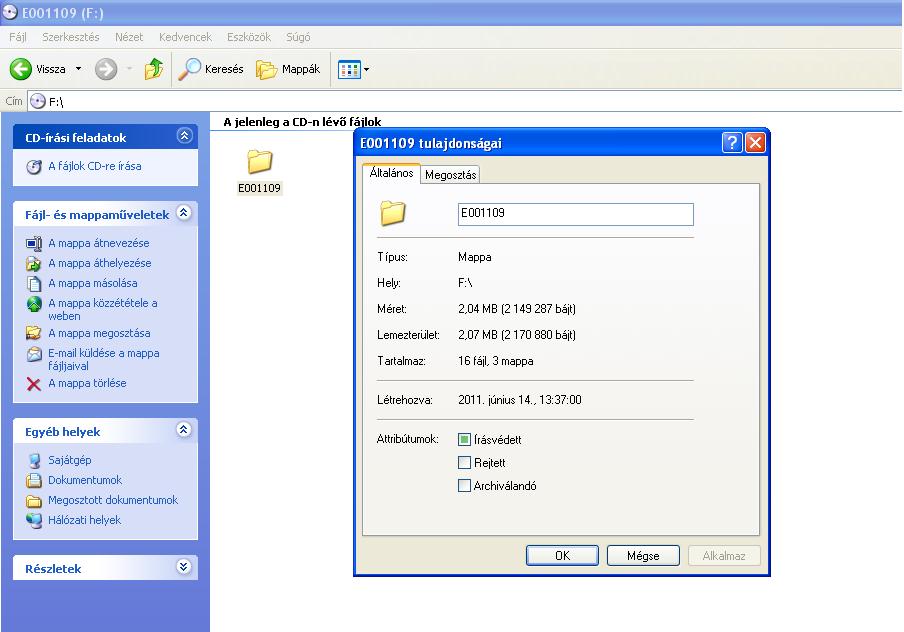 Jól látható, hogy a monitorról készített kép igazolja, az írásvédett Mappa létrehozási dátuma 2011. június 14. 13:37:00 óra.