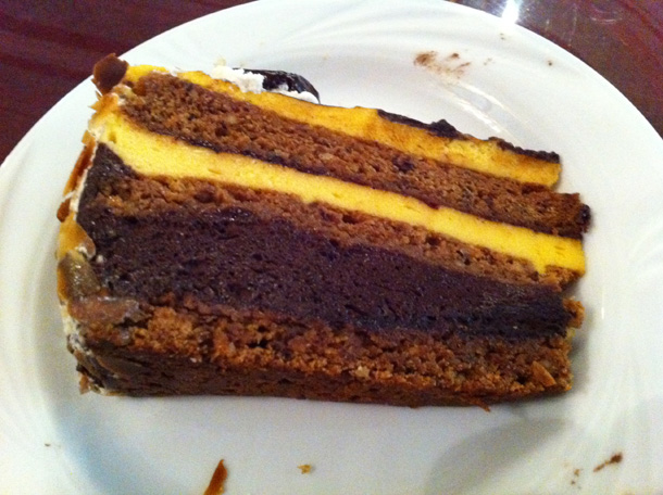 A cukrászdában kevés süteményt kínáltak, de inkább szerény, ám tökéletes legyen a választék, mint nagy és szárnyaszegett. A sütemények mindegyike elegáns volt. Én a szatmári szilvatortát választottam, mely tudtommal 2008-ban az ország tortája volt. Tetszett. Nem volt túl édes.